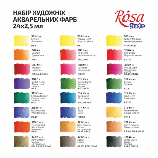 Set of watercolor paints, ROSA Studio, 24 colors, pans, cardboard