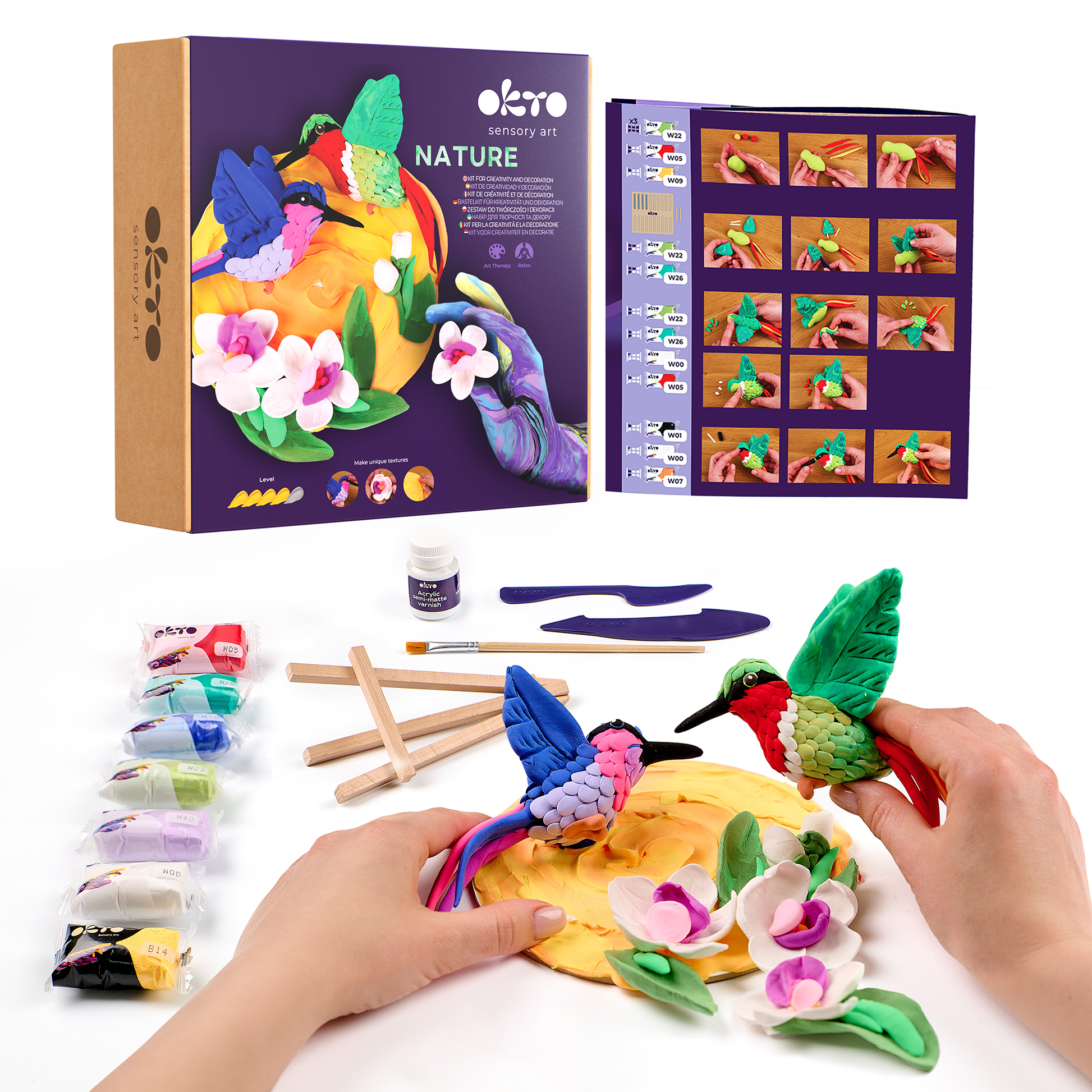 Sculpt a display‑worthy 3D artwork – 3D Hummingbirds – with OKTO air‑dry clay. The pre‑printed textured board (29 x 29 cm / 11.4 x 11.4 in) shows where to build highlights and depth; seal with varnish for a lasting finish. Perfect for craft nights, decor, and gifting. No baking required. Recommended for ages 14+ (intermediate/advanced).